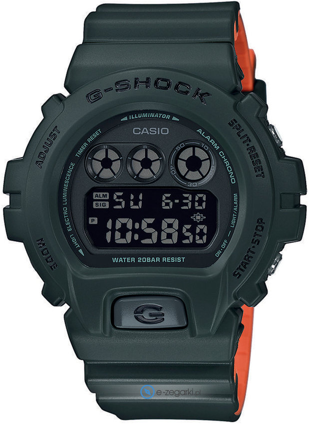 Zegarek męski DW-6900LU-3ER marki Casio należy do kolekcji Casio G-Shock. Styl zapewnia wysokiej jakości tarcza w kolorze czarnym. Zaprezentowana metodą cyfrową bieżąca godzina jest czytelna i szybka do odczytania. Koperta jest w kolorze zielonym szeroka jest na 50 mm oraz ma grubość 16 mm - ma okrągły kształt.