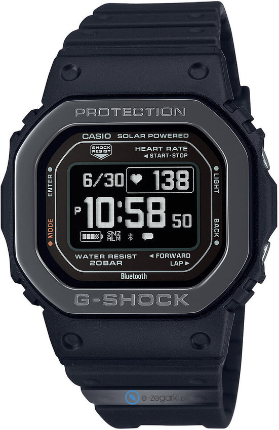 Wśród dodatkowych cech zegarka Casio DW-H5600MB-1ER można wymienić wskaźnik prędkości oraz bluetooth z pomocą którego sparujemy zegarek z telefonem.