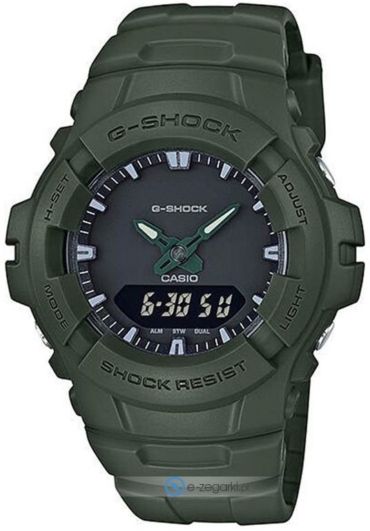 Zegarek G-100CU-3AER wyposażony jest w mechanizm zasilany klasyczną baterią kwarcową. Zwiększona odporność na wstrząsy oraz uderzenia zapewniona przez system wstrząsoodporny.