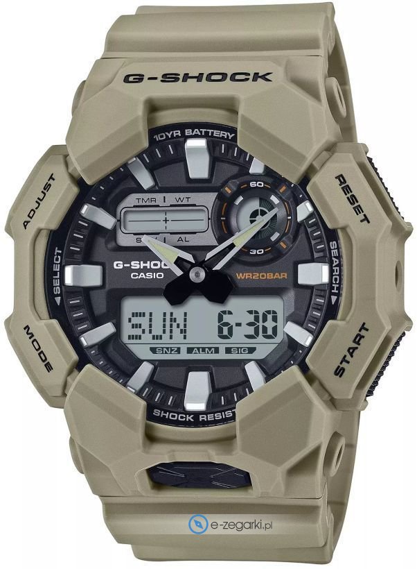 Kwarcowa bateria umieszczona w zegarku GA-010-5AER zapewnia zasilanie jego mechanizmu. Pasek w tonacji koloru zielonego wykonany jest z wysokiej jakości tworzywa sztucznego.