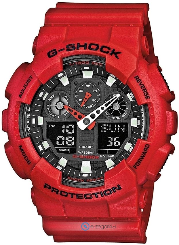 Zegarek męski GA-100B-4AER marki Casio to dobre połączenie funkcjonalności oraz modnego designu. Model ten w gamie pozostałych zegarków tego producenta występuje w serii Casio G-Shock. Stylu nadaje wysokiej klasy tarcza w kolorze szarym. Zegarek ten prezentuje godzinę w formacie analogowo - cyfrowym dzięki czemu odczyt jest bardzo łatwy. Koperta jest w kolorze czerwonym szeroka jest na 51 mm oraz ma grubość 16 mm - w kształcie okrągłym.