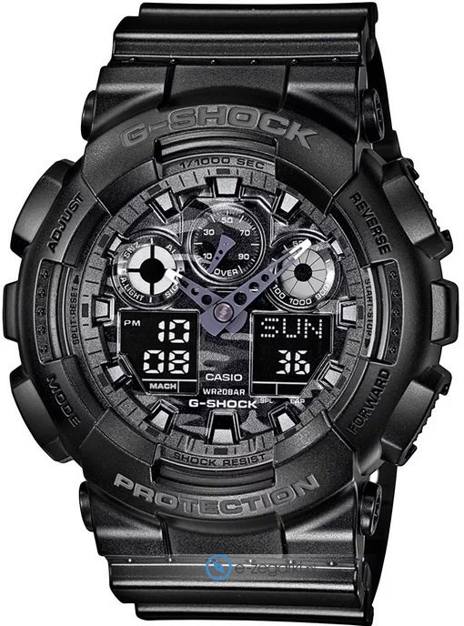 Model GA-100CF-1A posiada mechanizm zasilany standardową baterią kwarcową. System wstrząsoodporny zabezpiecza zegarek przeciwko wstrząsom i uderzeniom.