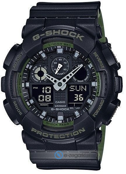 Model męski GA-100L-1AER marki Casio z serii Casio G-Shock. Stylu nadaje wysokiej klasy tarcza w kolorze czarnym. Zegarek ten prezentuje aktualny czas w formacie analogowo - cyfrowym dzięki temu odczyt jest intuicyjny. Koperta szeroka jest na 51 mm oraz ma grubość 16 mm - cechuje się okrągłym kształtem.