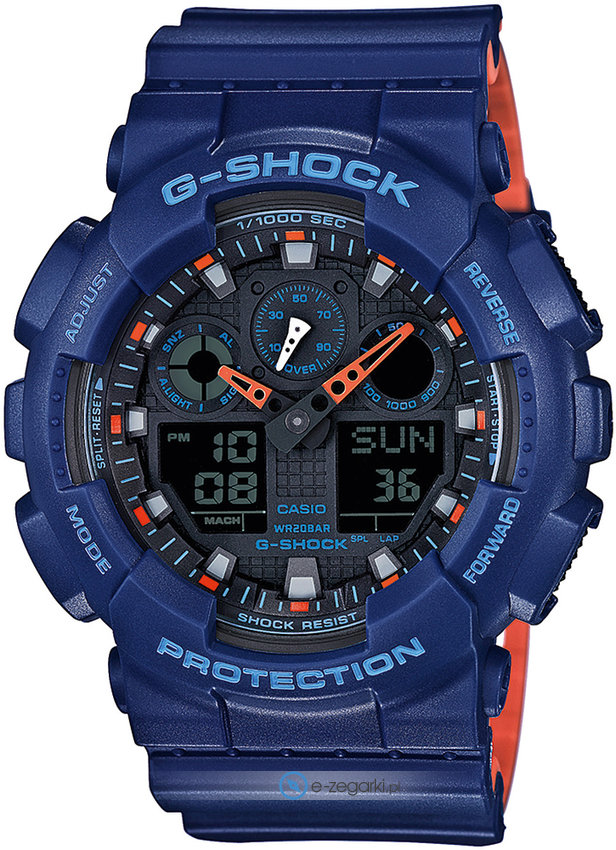 Zegarek GA-100L-2AER marki Casio to elegancki zegarek naręczny męski, który wyposażono w ciekawe rozwiązania i funkcje. Model ten należy do kolekcji Casio G-Shock. Niestereotypowy wygląd zegarka osiągnięto m.in. poprzez tarczę w kolorze czarnym. Aktualna godzina pokazywana jest w sposób analogowo - cyfrowy co niezmiernie łatwo pozwala ją odczytać. Koperta szeroka jest na 51 mm oraz ma grubość 16 mm - cechuje się okrągłym kształtem.