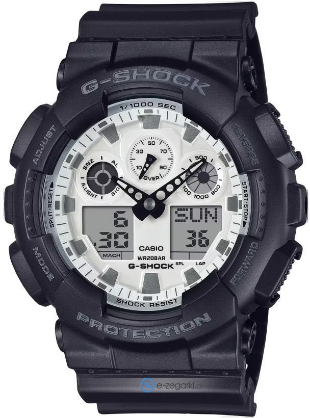 Casio GA-100WD-1AER - męski zegarek przeznaczony dla osób szukających zegarka z serii Casio G-Shock. Tarcza zegarka jest w kolorze białym. Godzina zaprezentowana jest w sposób analogowo - cyfrowy co intuicyjnie pozwala ją odczytać. Koperta jest w kolorze czarnym szeroka jest na 51 mm oraz ma grubość 17 mm - w kształcie okrągłym.