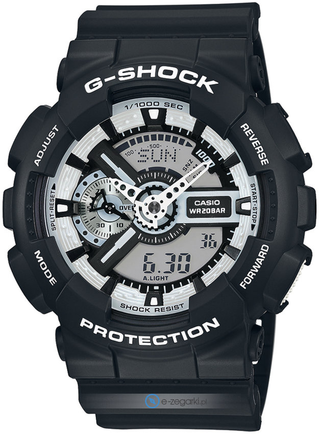 Casio GA-110BW-1AER to męski zegarek przeznaczony dla osób szukających zegarka z kolekcji Casio G-Shock. Zaprezentowana metodą analogowo - cyfrową bieżąca godzina jest czytelna i prosta do sprawdzenia. Koperta szeroka jest na 51 mm oraz ma grubość 16 mm.