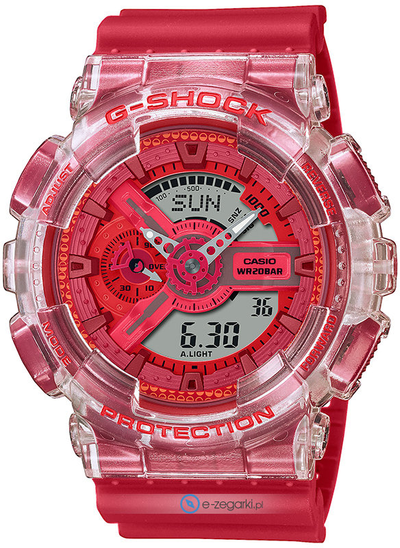 Zegarek GA-110GL-4AER zasilany jest bateryjnie - ogniwo kwarcowe. Pasek koloru czerwonego zrobiony jest z wysokiej jakości tworzywa sztucznego.