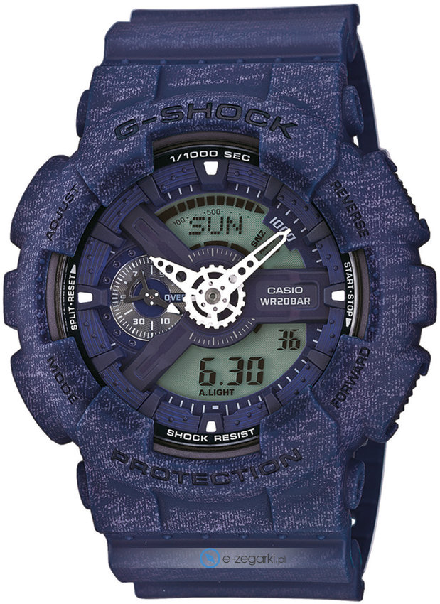 Zegarek GA-110HT-2AER marki Casio to gustowny zegarek naręczny męski, który posiada pomysłowe rozwiązania i funkcje. Model ten jest z kolekcji Casio G-Shock. Wysokiej trwałości cyferblat zegarka ozdobiono niebieskim kolorem. Zegarek ten prezentuje aktualny czas w formacie analogowo - cyfrowym dzięki czemu odczyt jest bardzo łatwy. Koperta w odcieniach koloru niebieskiego szeroka jest na 50 mm oraz ma grubość 17 mm - w kształcie okrągłym.