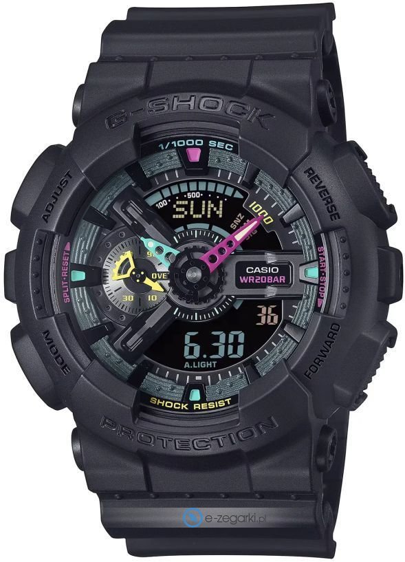 Model męski GA-110MF-1AER marki Casio z serii Casio G-Shock. Stylu nadaje wysokiej jakości tarcza w kolorze czarnym. Zaprezentowana metodą analogowo - cyfrową bieżąca godzina jest czytelna i prosta do odczytania. Koperta jest w kolorze czarnym szeroka jest na 50 mm oraz ma grubość 17 mm.