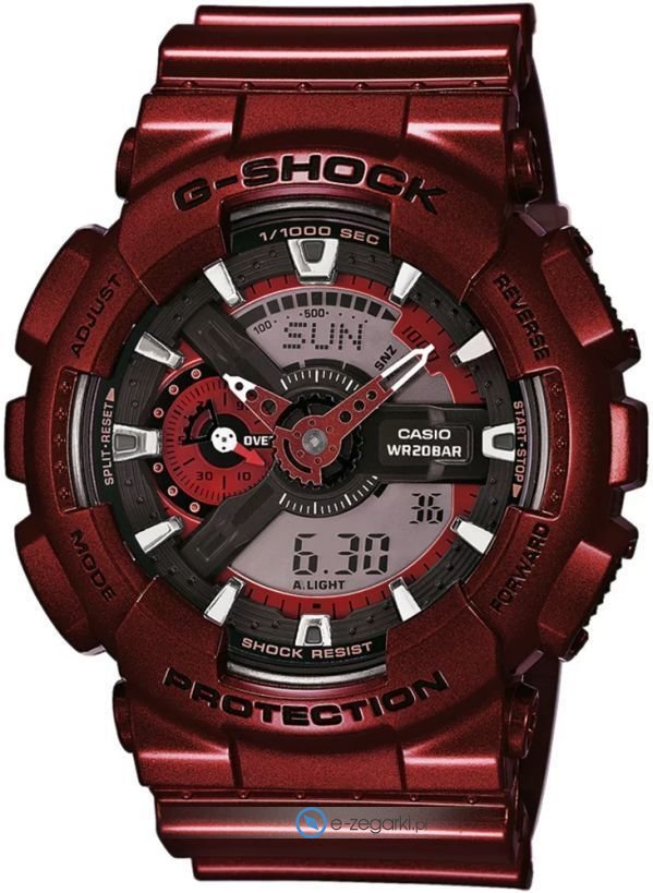 Zegarek męski GA-110NM-4AER należy do serii Casio G-Shock marki Casio. Cyferblat zegarka jest w kolorze czerwonym. Aktualna godzina prezentowana jest w sposób analogowo - cyfrowy co niezmiernie łatwo pozwala ją odczytać. Koperta została ozdobiona kolorem czerwonym szeroka jest na 55 mm oraz ma grubość 16.9 mm - w kształcie okrągłym.