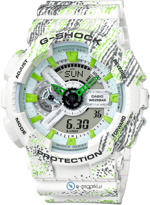 Zegarek GA-110TX-7AER zasilany jest za pomocą baterii kwarcowej. Zwiększona odporność na wstrząsy oraz uderzenia zapewniona przez system wstrząsoodporny.