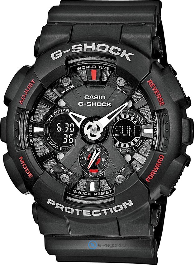 Zegarek GA-120-1AER marki Casio to stylowy zegarek naręczny męski, który jest wyposażony w ciekawe rozwiązania i funkcje. Model ten jest z serii Casio G-Shock. Zegarek ten pokazuje aktualny czas w formacie analogowo - cyfrowym dzięki temu odczyt jest bardzo łatwy. Koperta szeroka jest na 51 mm oraz ma grubość 16 mm.