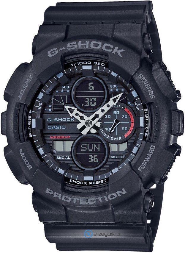 Zasilanie zegarka GA-140-1A1ER to tradycyjna bateria kwarcowa. Zwiększona odporność na wstrząsy oraz uderzenia zapewniona przez system wstrząsoodporny.