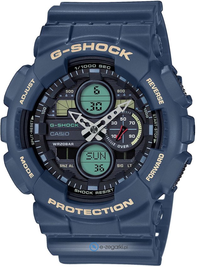 Zegarek męski GA-140-2AER marki Casio należy do serii Casio G-Shock. Aktualna godzina prezentowana jest w sposób analogowo - cyfrowy co intuicyjnie pozwala ją odczytać. Koperta szeroka jest na 51.2 mm oraz ma grubość 16.9 mm - w kształcie okrągłym.