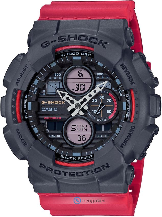 Zegarek GA-140-4AER marki Casio to gustowny zegarek naręczny męski, który wyposażono w pomysłowe rozwiązania oraz funkcje. Model ten pochodzi z serii Casio G-Shock. Zegarek ten prezentuje aktualny czas w formacie analogowo - cyfrowym dzięki czemu odczyt jest bardzo łatwy. Koperta w odcieniach koloru czarnego szeroka jest na 51.2 mm oraz ma grubość 16.9 mm - cechuje się okrągłym kształtem.