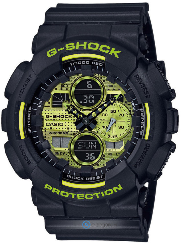 Męski zegarek GA-140DC-1AER z kolekcji Casio G-Shock marki Casio to połączenie stylu i nieprzeciętnych mechanizmów. Zegarek ten prezentuje aktualny czas w formacie analogowo - cyfrowym dzięki temu odczyt jest intuicyjny. Koperta w odcieniach koloru czarnego szeroka jest na 51.2 mm oraz ma grubość 16.9 mm - charakteryzuje się okrągłym kształtem.