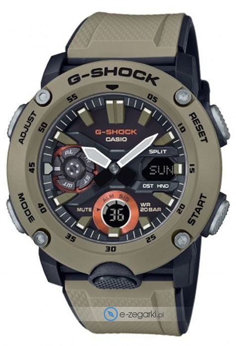 Model męski GA-2000-5AER zalicza się do serii Casio G-Shock marki Casio. Pokazana metodą analogowo - cyfrową aktualna godzina jest czytelna i prosta do sprawdzenia. Koperta szeroka jest na 48.7 mm oraz ma grubość 14.1 mm - ma okrągły kształt.
