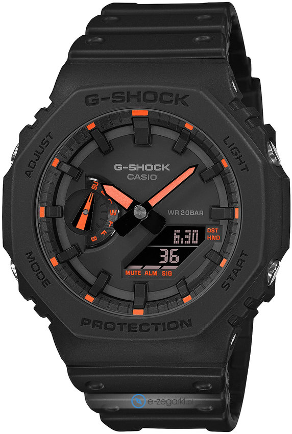 Zegarek męski GA-2100-1A4ER marki Casio to idealne połączenie funkcjonalności oraz modnego designu. Model ten w gamie pozostałych zegarków tego producenta występuje w serii Casio G-Shock. Atrakcyjną konstrukcję zegarka uzyskano dzięki tarczy w kolorze czarnym. Godzina prezentowana jest w sposób analogowo - cyfrowy co bez trudu pozwala ją odczytać. Koperta w odcieniach koloru czarnego szeroka jest na 45 mm oraz ma grubość 12 mm - ma okrągły kształt.