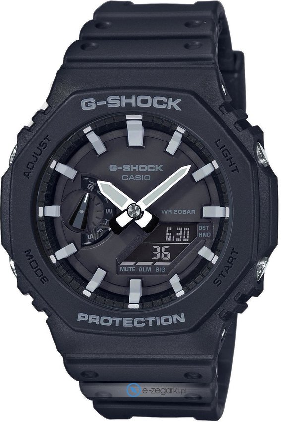 Zegarek GA-2100-1AER marki Casio to elegancki zegarek naręczny męski, który posiada pomysłowe rozwiązania oraz funkcje. Model ten jest z kolekcji Casio G-Shock. Charakter zapewnia wysokiej jakości cyferblat w kolorze ciemnym. Pokazana metodą analogowo - cyfrową aktualna godzina jest czytelna i prosta do odczytania. Koperta w odcieniach koloru czarnego szeroka jest na 45.4 mm oraz ma grubość 11.8 mm - w kształcie ośmiokątnym.
