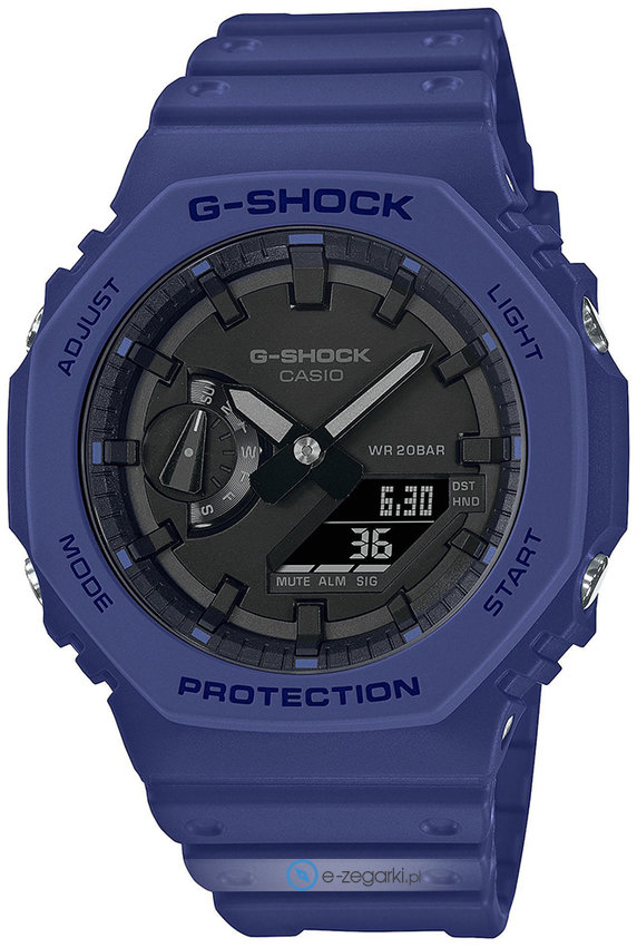 Kwarcowa bateria zamontowana w zegarku GA-2100-2AER zapewnia zasilanie jego mechanizmu. Pasek niebieskiego koloru zrobiony jest z wysokiej jakości tworzywa sztucznego.