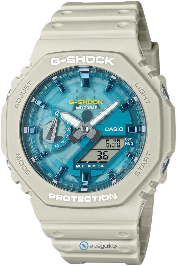 Model GA-2100AS-5AER posiada mechanizm zasilany standardową baterią kwarcową. Pasek jest w kolorze beżowym zrobiony jest z wysokiej jakości tworzywa sztucznego.