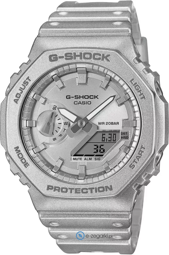 Casio GA-2100FF-8AER - męski zegarek kierowany dla osób szukających zegarka z rodziny Casio G-Shock. Ciekawy wygląd zegarka osiągnięto m.in. poprzez cyferblat w kolorze srebrnym. Zegarek ten prezentuje aktualny czas w formacie analogowo - cyfrowym dzięki temu odczyt jest intuicyjny. Koperta jest w kolorze srebrnym szeroka jest na 45 mm oraz ma grubość 12 mm - w kształcie okrągłym.