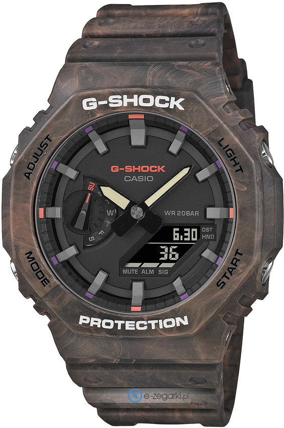 Zegarek męski GA-2100FR-5AER marki Casio należy do serii Casio G-Shock. Tarcza zegarka jest w kolorze czarnym. Aktualna godzina przedstawiona jest w sposób analogowo - cyfrowy co intuicyjnie pozwala ją odczytać. Koperta szeroka jest na 45 mm oraz ma grubość 12 mm - w kształcie okrągłym.