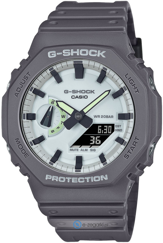 Model męski GA-2100HD-8AER z rodziny Casio G-Shock marki Casio. Charakteru dodaje wysokiej klasy tarcza w kolorze białym. Zegarek ten prezentuje aktualny czas w formacie analogowo - cyfrowym dzięki temu odczyt jest bardzo łatwy. Koperta została pokryta kolorem szarym szeroka jest na 45 mm oraz ma grubość 12 mm - ma okrągły kształt.