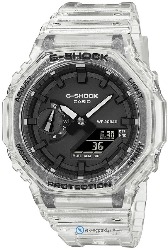 Zegarek męski GA-2100SKE-7AER marki Casio to idealne połączenie funkcjonalności oraz modnego designu. Model ten w gamie innych zegarków tego producenta występuje w serii Casio G-Shock. Wysokiej jakości cyferblat zegarka ozdobiono czarnym kolorem. Zegarek ten pokazuje aktualny czas w formacie analogowo - cyfrowym dzięki czemu odczyt jest bezproblemowy. Koperta szeroka jest na 45 mm oraz ma grubość 12 mm - cechuje się okrągłym kształtem.