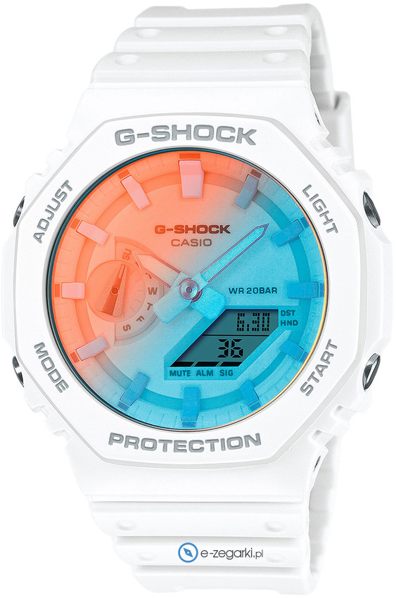 Zegarek GA-2100TL-7AER posiada kwarcowy mechanizm zasilany tradycyjną baterią. Pasek jest w kolorze białym wykonany jest z wysokiej jakości tworzywa sztucznego.