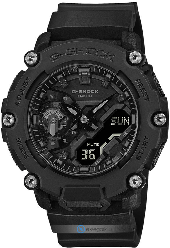 Zegarek GA-2200BB-1AER posiada kwarcowy mechanizm zasilany standardową baterią. Zwiększona odporność na wstrząsy oraz uderzenia zapewniona przez system wstrząsoodporny.