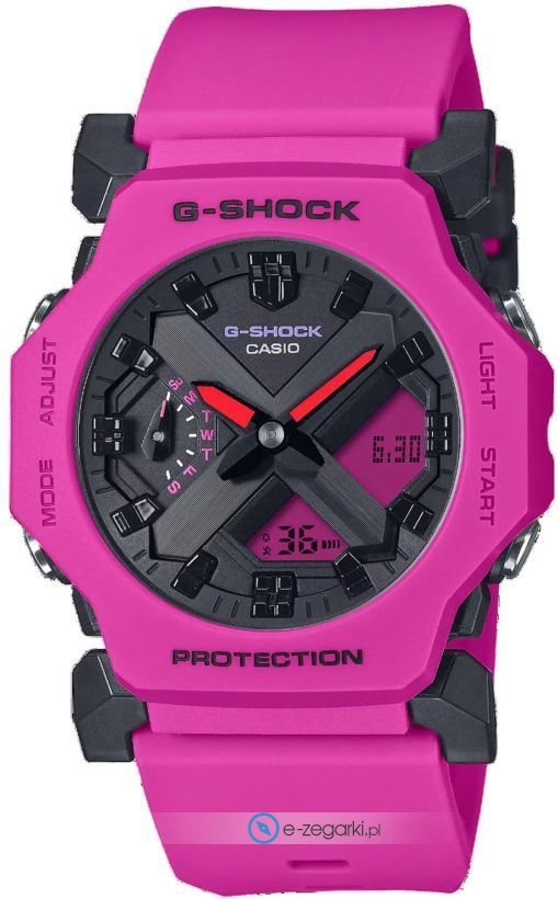 Zasilanie zegarka GA-2300-4AER to normalna bateria kwarcowa. Pasek w tonacji koloru różowego wykonany jest z wysokiej jakości tworzywa sztucznego.