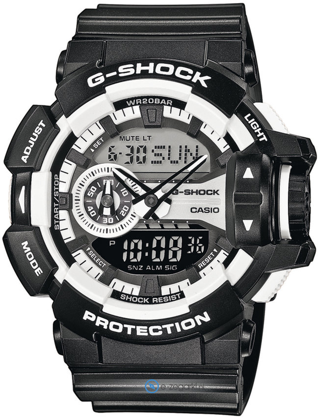 Zegarek GA-400-1AER zasilany jest za pomocą baterii kwarcowej. System wstrząsoodporny chroni zegarek przeciwko wstrząsom i uderzeniom.