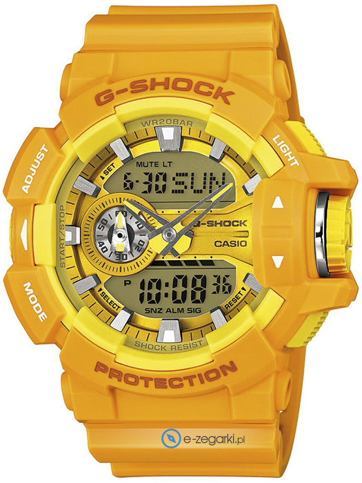 Zegarek męski GA-400A-9AER marki Casio to stylowe połączenie funkcjonalności a także ciekawego designu. Model ten w gamie innych zegarków tego producenta występuje w kolekcji Casio G-Shock. Tarcza zegarka w kolorze żółtym. Godzina pokazywana jest w sposób analogowo - cyfrowy co bez trudu pozwala ją odczytać. Koperta szeroka jest na 52 mm oraz ma grubość 18.3 mm - posiada okrągły kształt.