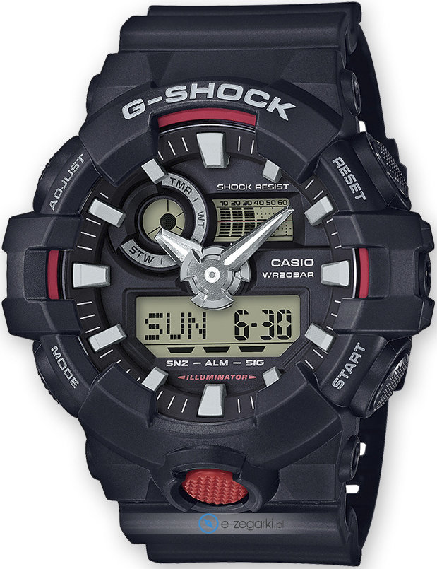 Model męski GA-700-1AER marki Casio z rodziny Casio G-Shock. Atrakcyjną stylistykę zegarka uzyskano z pomocą tarczy w kolorze czarnym. Pokazana metodą analogowo - cyfrową bieżąca godzina jest czytelna i łatwa do sprawdzenia. Koperta w odcieniach koloru czarnego szeroka jest na 50 mm oraz ma grubość 18 mm - cechuje się okrągłym kształtem.