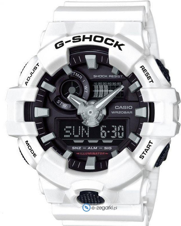 Zegarek męski GA-700-7A należy do rodziny Casio G-Shock marki Casio. Charakter zapewnia wysokiej klasy tarcza w kolorze czarnym. Zegarek ten pokazuje aktualny czas w formacie analogowo - cyfrowym dzięki czemu odczyt jest bardzo łatwy. Koperta w odcieniach koloru białego szeroka jest na 53 mm oraz ma grubość 18 mm - w kształcie okrągłym.
