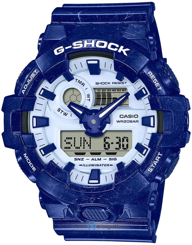 Zasilanie zegarka GA-700BWP-2AER to klasyczna bateria kwarcowa. Pasek koloru niebieskiego zrobiony jest z wysokiej jakości tworzywa sztucznego.
