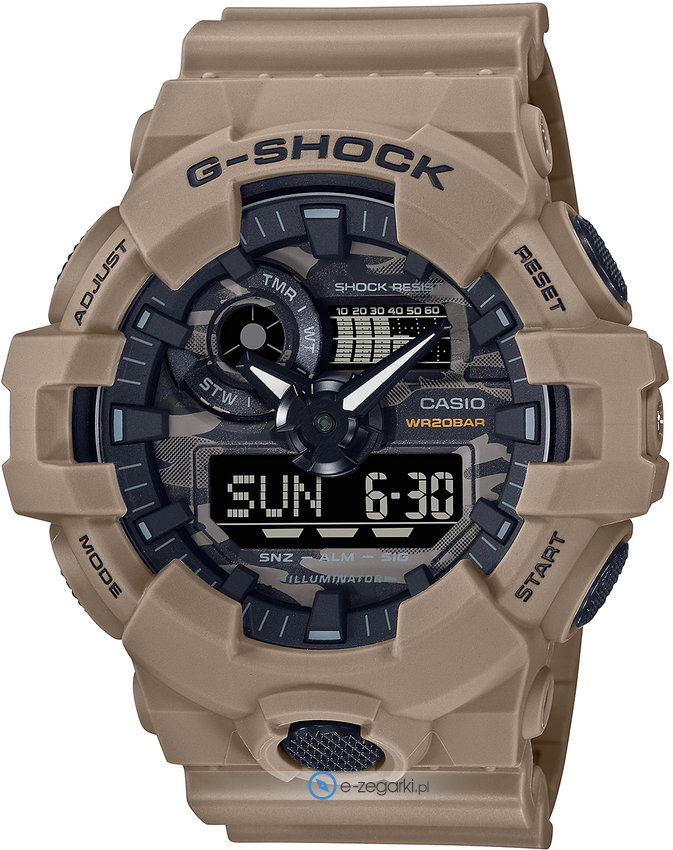 Casio GA-700CA-5AER - męski zegarek kierowany dla osób szukających zegarka z kolekcji Casio G-Shock. Charakter zapewnia wysokiej klasy cyferblat w kolorze szarym. Zegarek ten prezentuje aktualny czas w formacie analogowo - cyfrowym dzięki temu odczyt jest bardzo łatwy. Koperta szeroka jest na 53 mm oraz ma grubość 18 mm - w kształcie okrągłym.