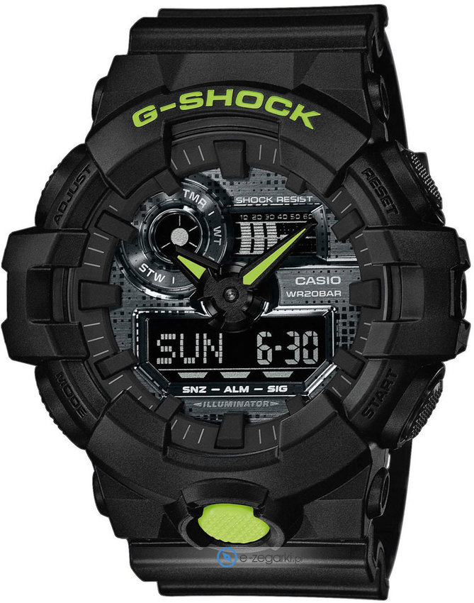 Zegarek męski GA-700DC-1AER marki Casio to dobre połączenie funkcjonalności a także modnego wzornictwa. Model ten w gamie innych zegarków tego producenta występuje w kolekcji Casio G-Shock. Cyferblat zegarka w kolorze czarnym. Zegarek ten pokazuje godzinę w formacie analogowo - cyfrowym dzięki temu odczyt jest bardzo łatwy. Koperta została ozdobiona kolorem czarnym szeroka jest na 53.4 mm oraz ma grubość 18.4 mm - cechuje się okrągłym kształtem.