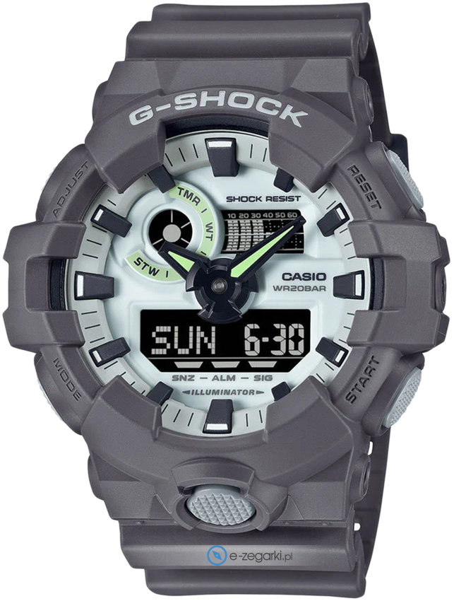 Kwarcowa bateria zamontowana w zegarku GA-700HD-8AER zapewnia zasilanie jego mechanizmu. Pasek w tonacji koloru szarego wykonany jest z wysokiej jakości tworzywa sztucznego.