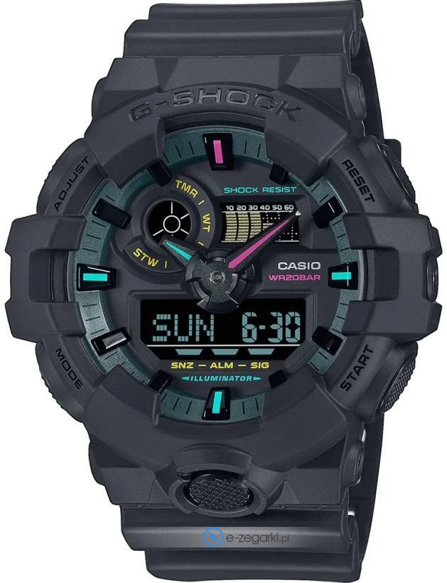 Zegarek GA-700MF-1AER marki Casio to gustowny zegarek naręczny męski, który jest wyposażony w ciekawe rozwiązania oraz funkcje. Model ten należy do kolekcji Casio G-Shock. Atrakcyjny wygląd czasomierza osiągnięto również dzięki tarczy w kolorze czarnym. Zaprezentowana metodą analogowo - cyfrową bieżąca godzina jest czytelna i szybka do sprawdzenia. Koperta w odcieniach koloru czarnego szeroka jest na 53 mm oraz ma grubość 18 mm - wyróżnia się okrągłym kształtem.