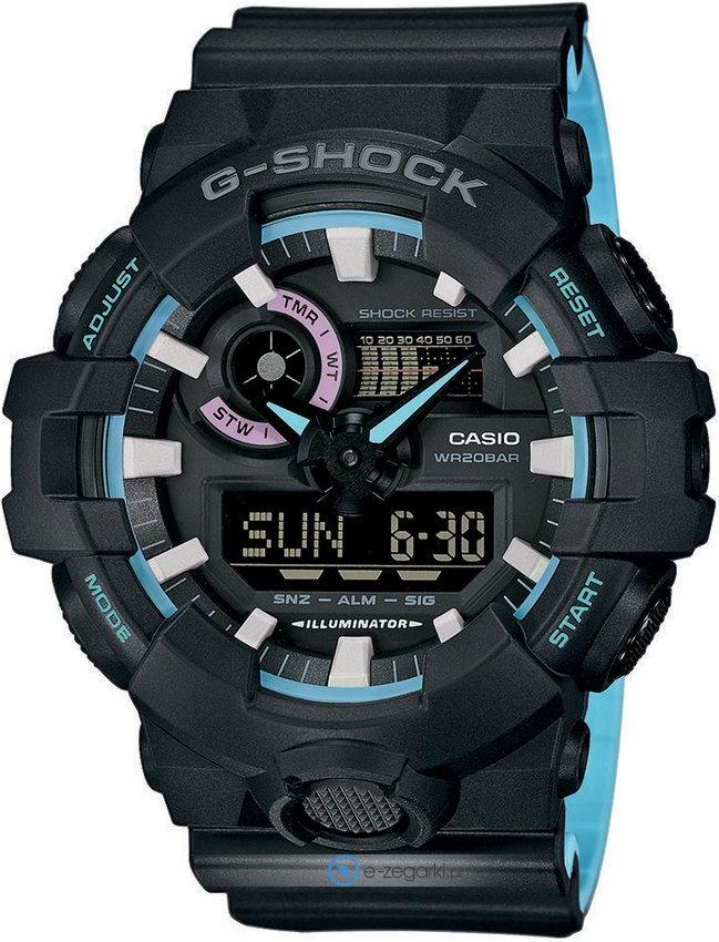 Męski zegarek GA-700PC-1AER z serii Casio G-Shock marki Casio to połączenie smaku oraz oryginalnych funkcji. Nieschematyczny wygląd zegarka osiągnięto m.in. poprzez tarczę w kolorze czarnym. Zegarek ten pokazuje aktualny czas w formacie analogowo - cyfrowym dzięki temu odczyt jest bardzo łatwy. Koperta w odcieniach koloru czarnego szeroka jest na 53 mm oraz ma grubość 18 mm - w kształcie okrągłym.