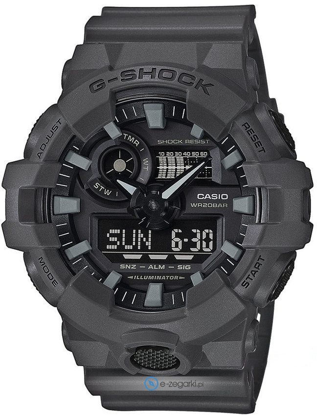 Model męski GA-700UC-8AER z kolekcji Casio G-Shock marki Casio. Ciekawy wygląd zegarka osiągnięto m.in. poprzez cyferblat w kolorze czarnym. Pokazana metodą analogowo - cyfrową bieżąca godzina jest czytelna i prosta do odczytania. Koperta jest w kolorze szarym szeroka jest na 53 mm oraz ma grubość 18 mm - w kształcie okrągłym.