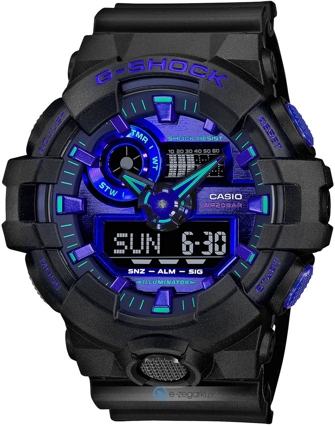 Zegarek męski GA-700VB-1AER marki Casio to idealne połączenie funkcjonalności oraz ciekawego wzornictwa. Model ten w gamie innych zegarków tego producenta występuje w serii Casio G-Shock. Charakter zapewnia wysokiej klasy cyferblat w kolorze niebieskim. Zegarek ten prezentuje aktualny czas w formacie analogowo - cyfrowym dzięki czemu odczyt jest bezproblemowy. Koperta w barwach koloru czarnego szeroka jest na 53 mm oraz ma grubość 18 mm - ma okrągły kształt.