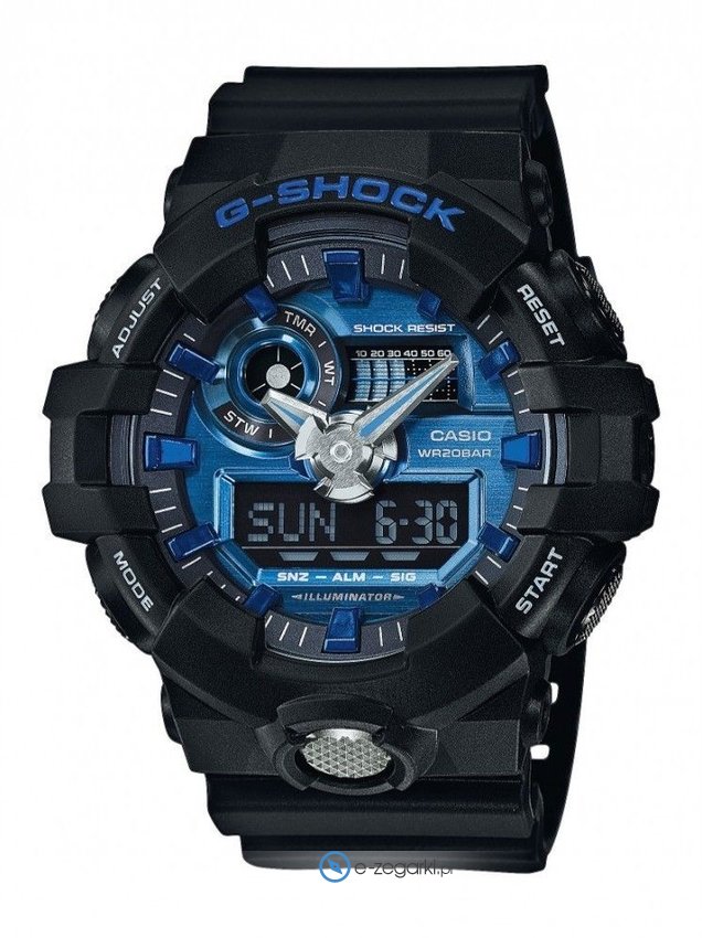 Męski zegarek GA-710-1A2ER z kolekcji Casio G-Shock marki Casio to połączenie stylu oraz nowatorskich mechanizmów. Stylu dodaje wysokiej jakości cyferblat w kolorze niebieskim. Pokazana metodą analogowo - cyfrową aktualna godzina jest czytelna i prosta do odczytania. Koperta szeroka jest na 50 mm oraz ma grubość 18 mm.