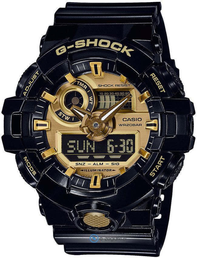 Casio GA-710GB-1AER to męski zegarek przeznaczony dla osób szukających zegarka z rodziny Casio G-Shock. Charakter zapewnia wysokiej klasy cyferblat w kolorze złotym. Aktualna godzina przedstawiona jest w sposób analogowo - cyfrowy co bez trudu pozwala ją odczytać. Koperta została pokryta kolorem czarnym szeroka jest na 50 mm oraz ma grubość 16 mm - posiada okrągły kształt.