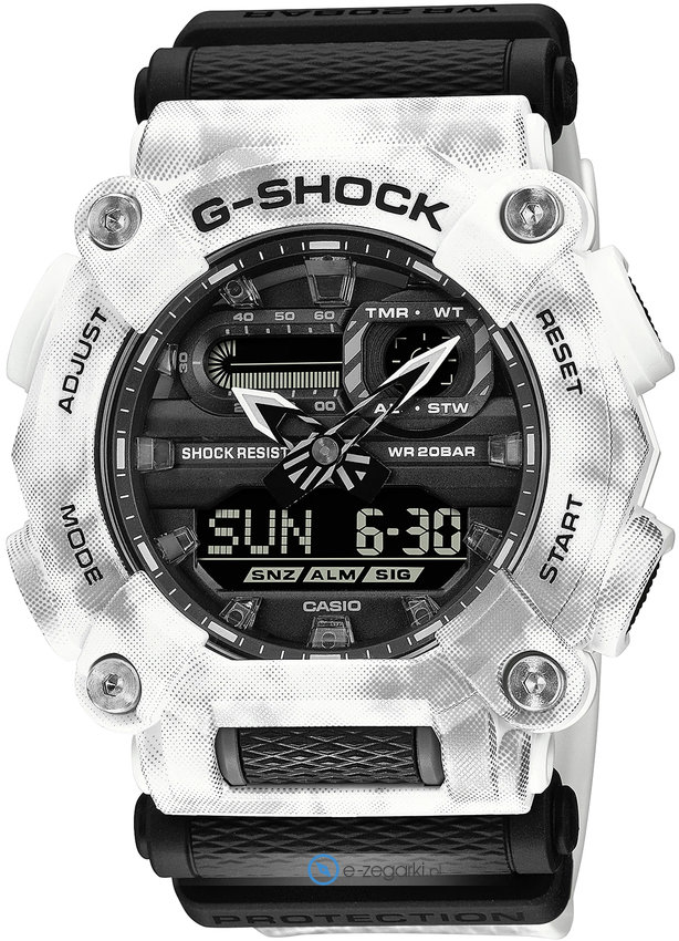 Zegarek GA-900GC-7AER posiada kwarcowy mechanizm zasilany standardową baterią. Pasek w odcieniach koloru białego wykonany jest z wysokiej jakości tworzywa sztucznego.