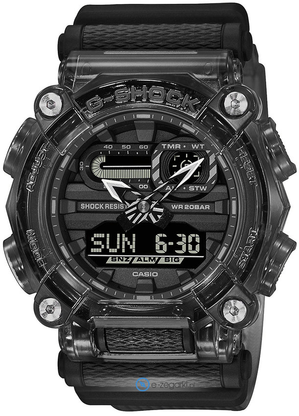 Zegarek GA-900SKE-8AER posiada kwarcowy mechanizm zasilany standardową baterią. Zwiększona odporność na wstrząsy oraz uderzenia zapewniona przez system wstrząsoodporny.