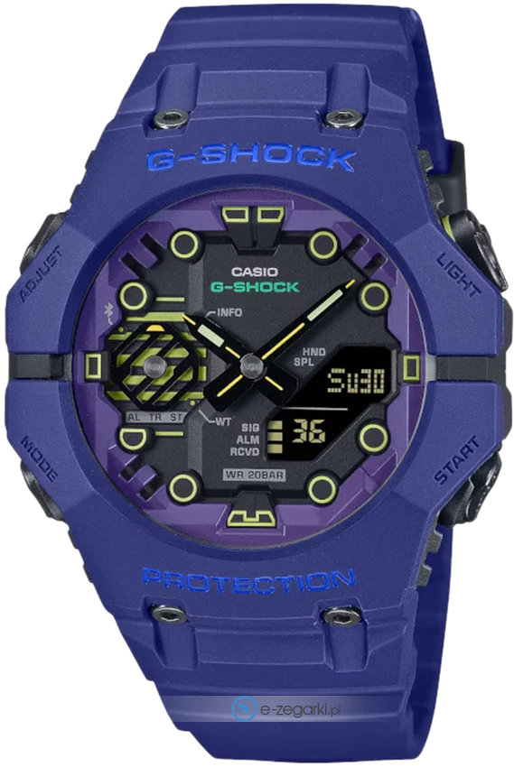 Casio GA-B001CBR-2AER to męski zegarek kierowany dla osób szukających zegarka z kolekcji Casio G-Shock. Niestereotypowy wygląd zegarka osiągnięto m.in. poprzez cyferblat w kolorze czarnym. Zegarek ten prezentuje godzinę w formacie analogowo - cyfrowym dzięki czemu odczyt jest intuicyjny. Koperta jest ozdobiona kolorem niebieskim szeroka jest na 46 mm oraz ma grubość 14 mm.