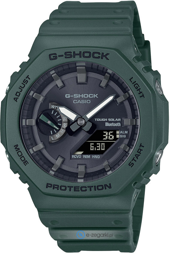 Model męski GA-B2100-3AER marki Casio należy do serii Casio G-Shock. Charakterystyczny wygląd zegarka uzyskano również dzięki tarczy w kolorze czarnym. Zegarek ten prezentuje godzinę w formacie analogowo - cyfrowym dzięki czemu odczyt jest bardzo łatwy. Koperta została ozdobiona kolorem zielonym szeroka jest na 45 mm oraz ma grubość 12 mm - cechuje się okrągłym kształtem.